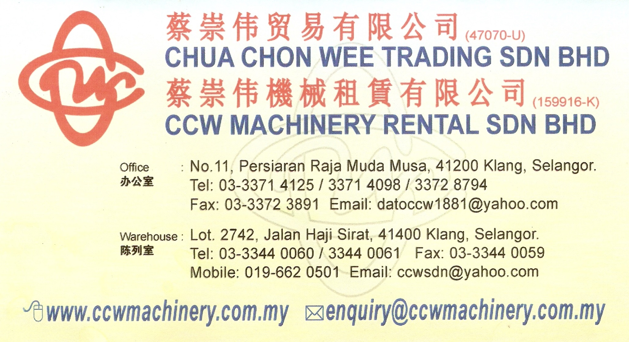 Our company CCW MACHINERY RENTAL SDN BHD. Incorporated in 1987 specializing in sales and rental construction & engineering equipments is a subsidiary company of CHUA CHON WEE TRADING SDN BHD.